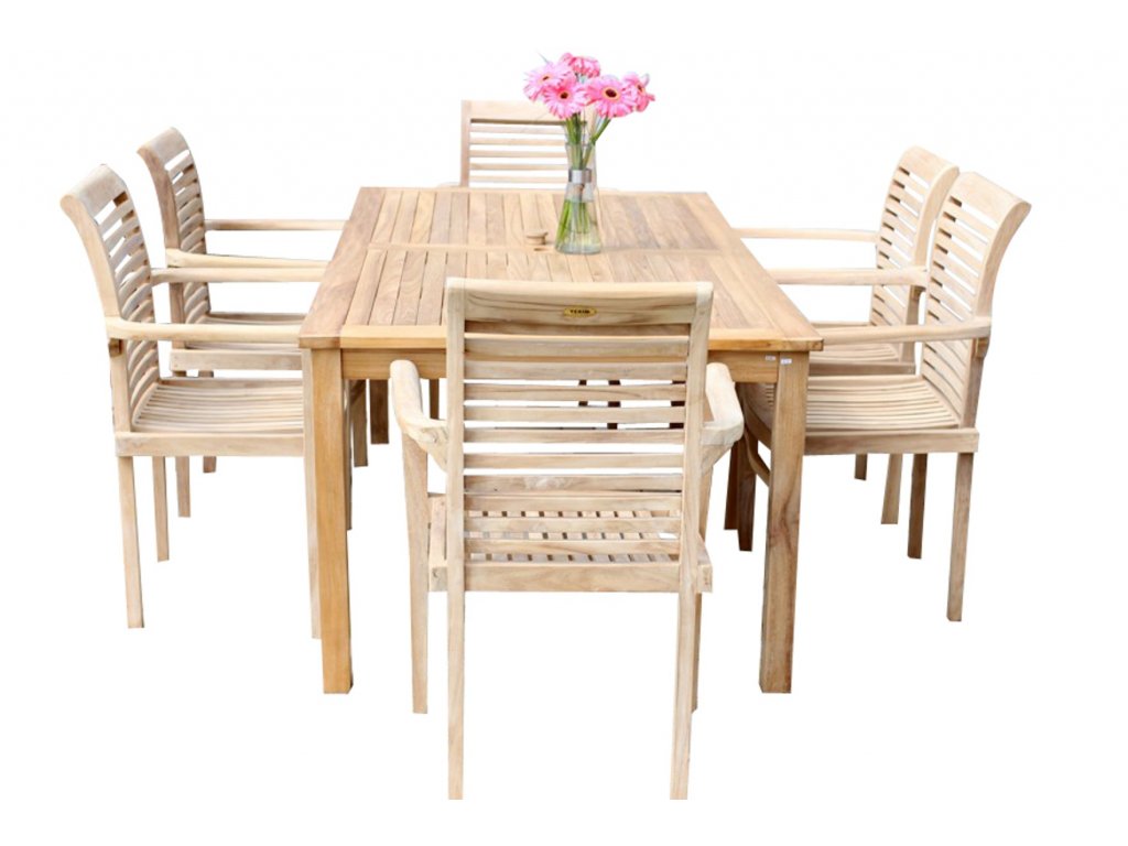 Hranatý teakový robustní stůl a 6 stohovatelných křesel Stucking tvoří dohromady opravdu luxusní sestavu nábytku pro Vaši zahradu