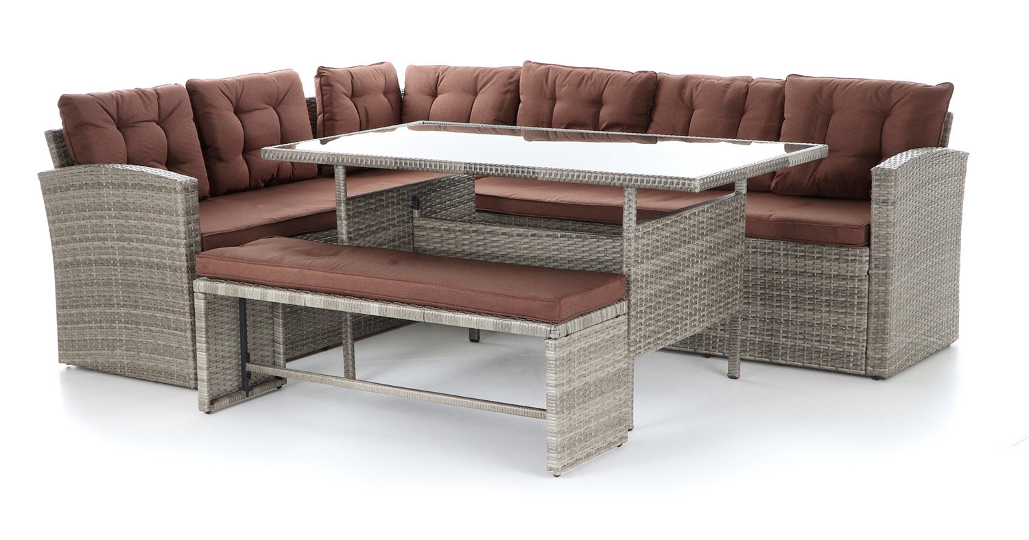 Luxusní rohová zahradní sestava s jídelním stolem určena k příjemnému posezení při relaxu s přáteli na terase či zimní zahradě.