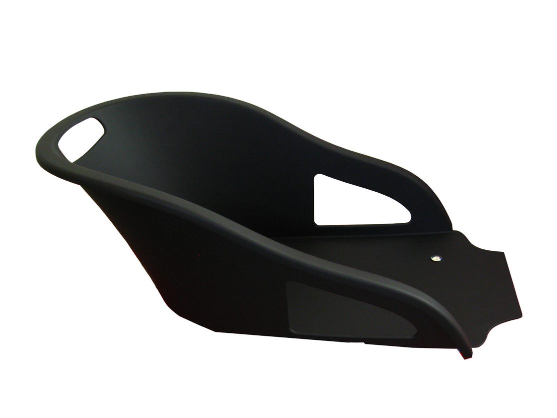 Černé sedátko od výrobce Plastkon je příslušenstvím k saním Firecom. Děti se mohou na sáňkách pohodlně zapřít do sedátka.