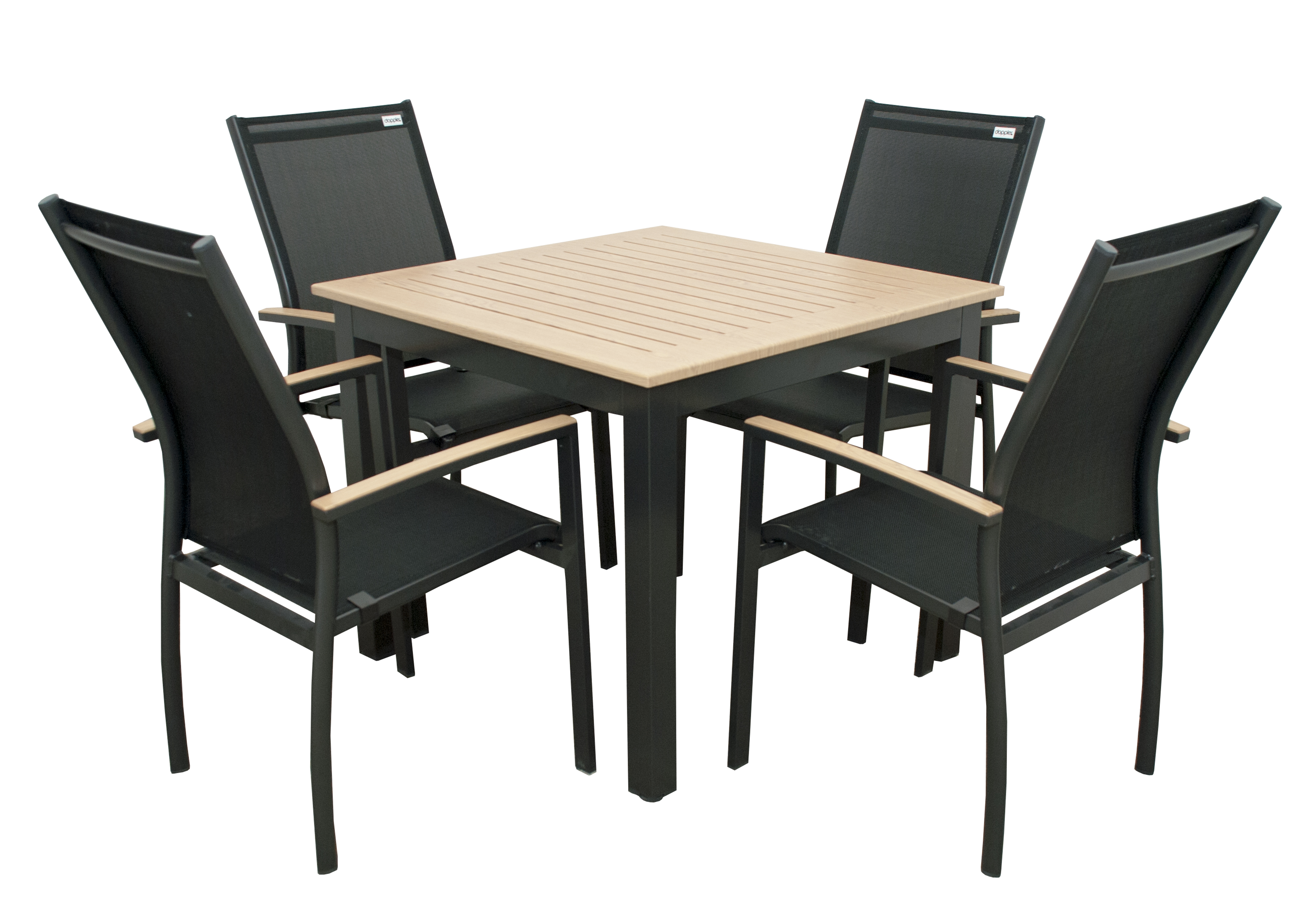 Skládá se z: 4x stohovací židle, 1x stůl 90x90 cm