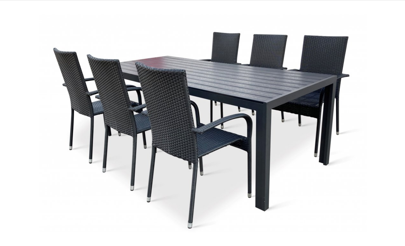 Sestava zahrnuje krásný stůl vyrobený z materiálů, které nevyžadují zvláštní údržbu. Konstrukce z hliníku ošetřeného proti rzi, deska stolu z Artwoodu a adaptéry u nohou pro větší stabilitu. Klasické tvary a černé provedení stolu.