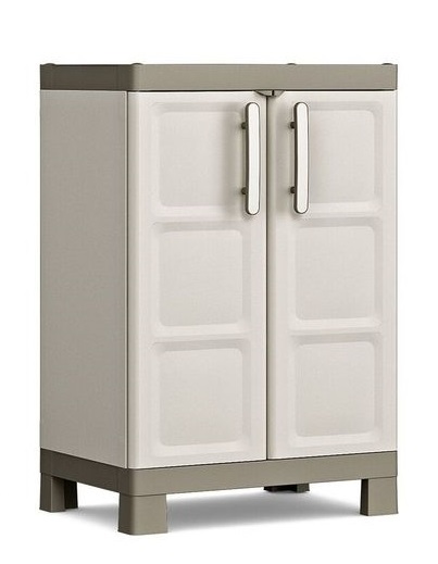 Nízká plastová skříň LOW obsahuje 2 poličky, z nichž každá unese 15 kg.