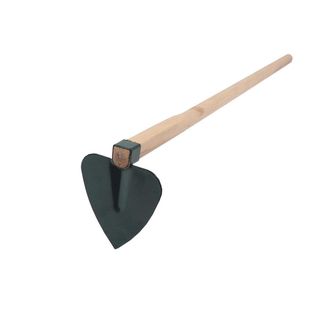 Srdcová motyka s dřevěnou násadou.